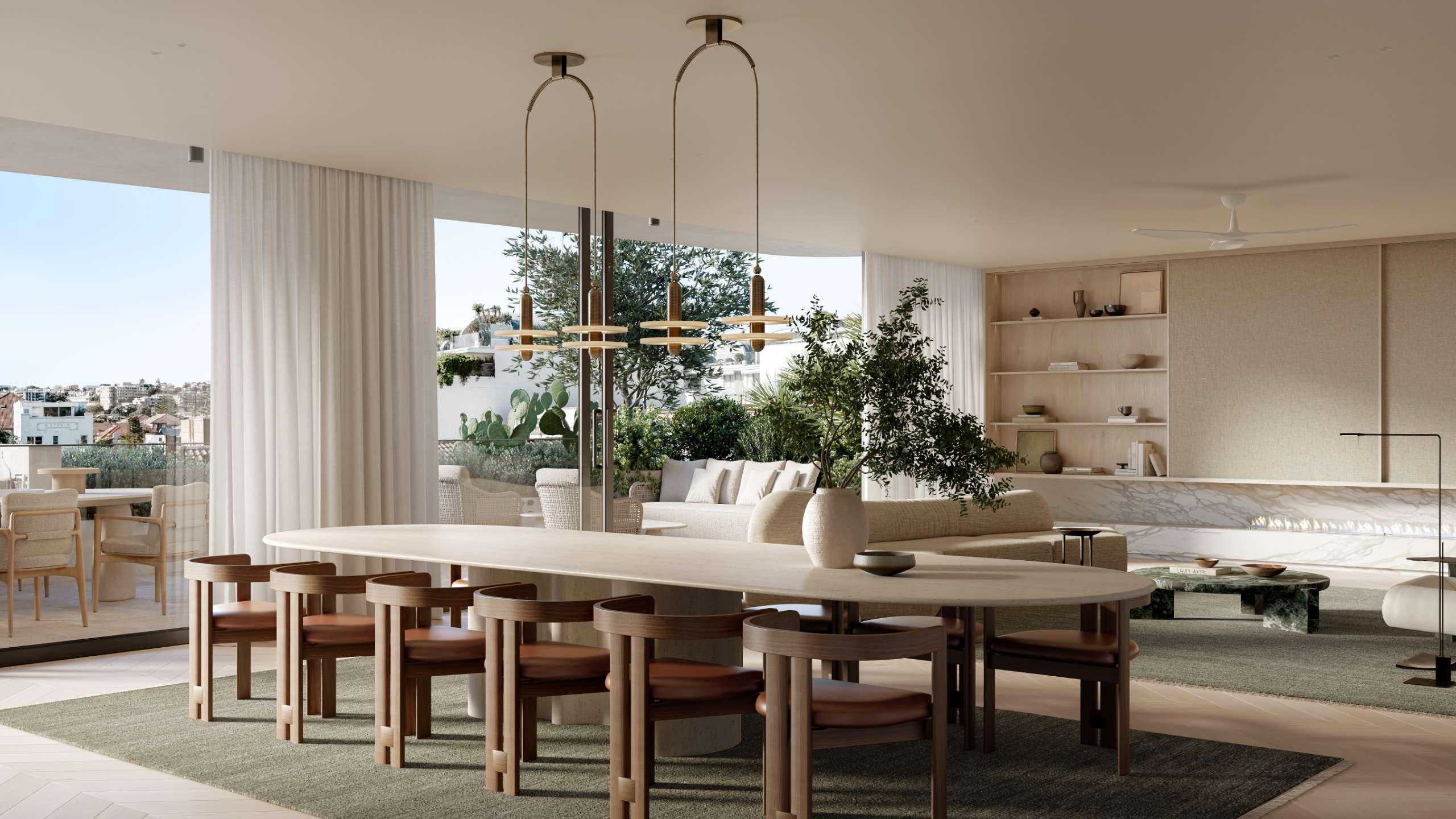 The art of the coastal kitchen, redefined. A magnificent marble kitchen is a sculptural piece and celebration of Sydney’s love of indoor-outdoor entertaining. The sea of carved natural stone honours the artisan’s craft, beautiful to the eye and touch and illuminated by cascading light from the skylight during the day and moonlight glow in the evening. It extends into the voluminous living area, opens to the north-facing terrace and tells an eloquent story without the need to shout. The luxury of space, light and architectural form.